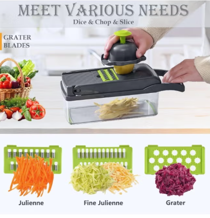 تتضمن 8 شفرات متخصصة لتقطيع البصل والجزر والثوم وغيرها، مما يوفر لك حلاً شاملاً لتحضير الوجبات -